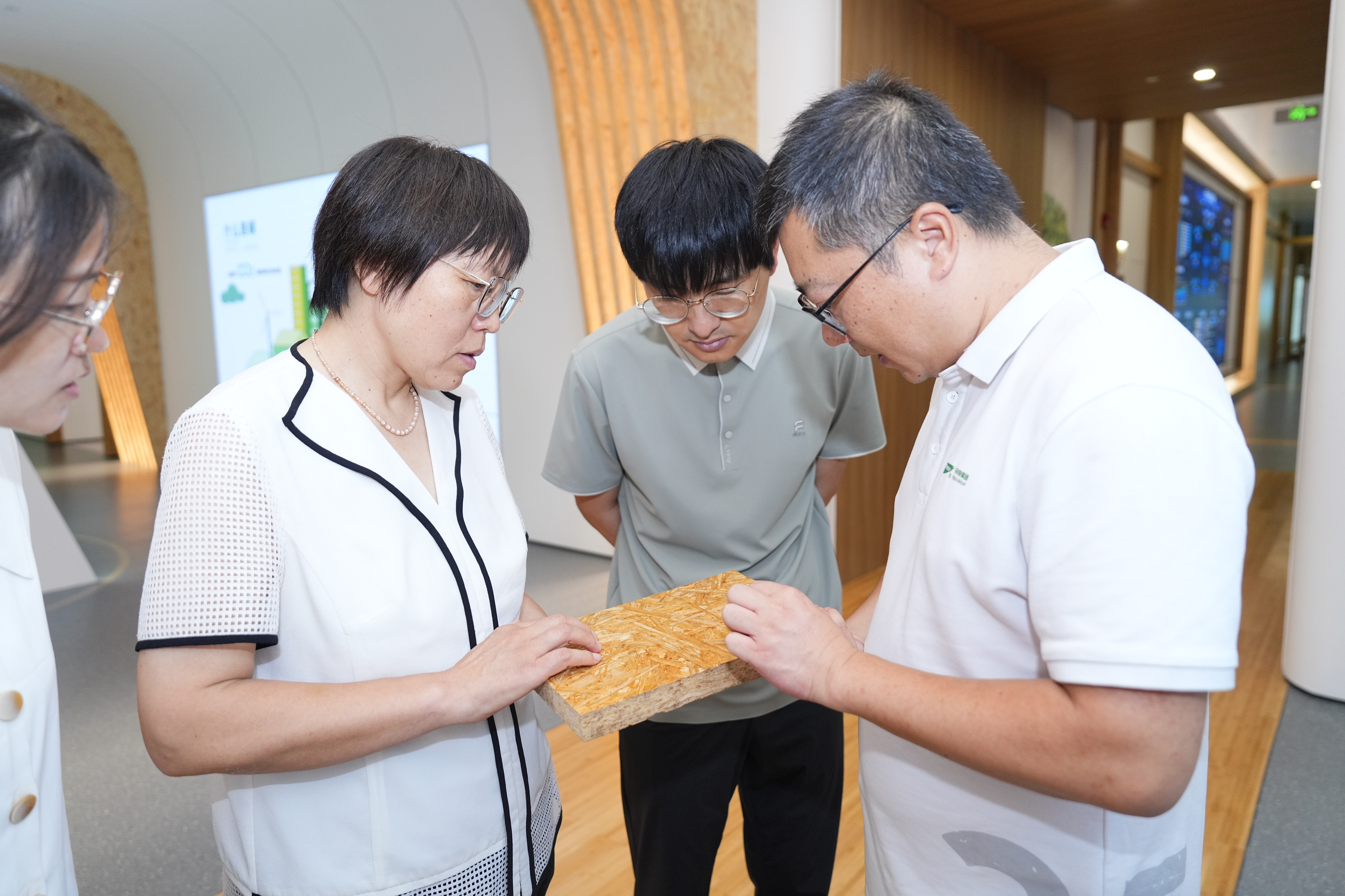 住建部首席专家刘美霞一行首先参观了千年舟木本馆,详细了解千年舟集团在绿色建材领域的发展历程与技术积累,对千年舟绿色产品、可持续发展理念及智能制造给予高度评价。