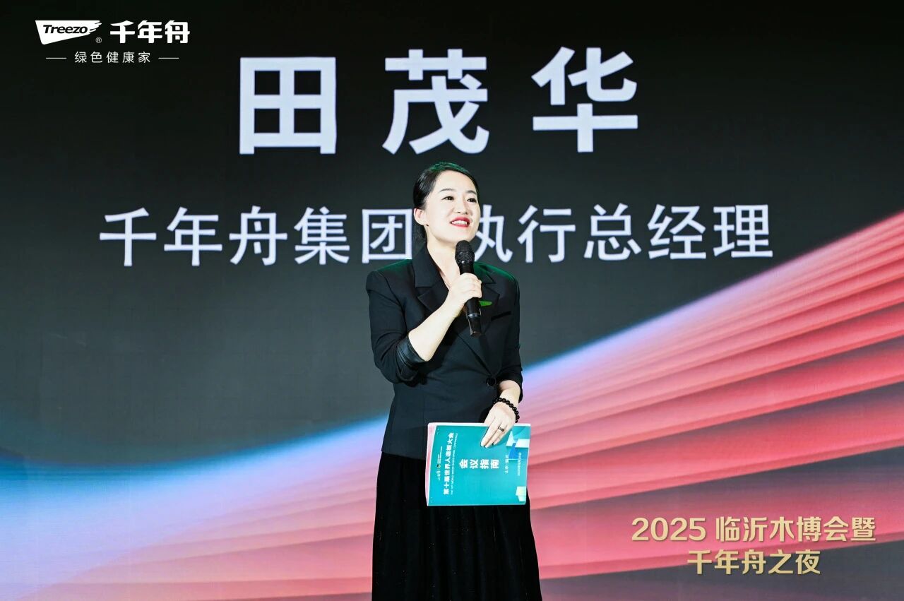 在下午举行的第十届世界人造板大会上,千年舟集团执行总经理田茂华发表主题演讲,向现场来宾分享了千年舟用绿色科技赋能人居,打造差异化价值,驱动新增长的行业突围之路。