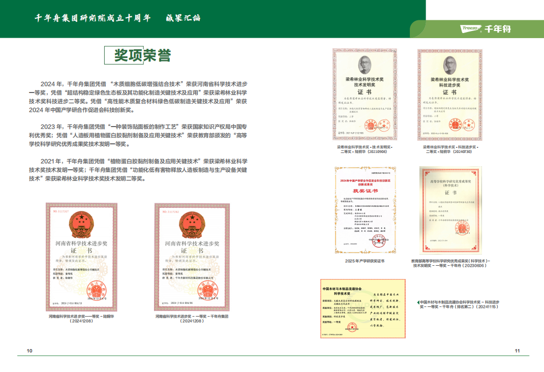 千年舟研究院自2015年成立,始终锚定国家绿色建材产业升级方向,成为集团创新的“核心引擎”。十年间,从天然豆香板环保升级到实木切片OSB3型板量产,从锌效抗菌2.0技术突破到新型难燃OSB板研发,累计攻克多项行业关键技术。更以“木制细胞低碳增强结合关键技术”斩获河南省科技进步一等奖,主导的PET高光泽耐黄变饰面板入选“浙江制造精品”,技术实力获国家与行业双重认可。