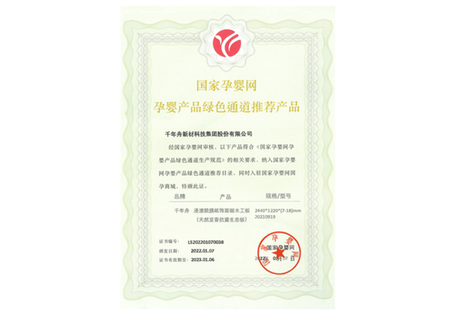千年舟板材获“国家孕婴网入网推荐证书”!