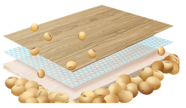 千年舟天然豆香系列板材中采用的是大豆胶,一种以豆粕为主要原料,以水为分散介质的无醛级胶黏剂。大豆胶适用于各种竹、木材料的胶接,能使板材的环保粘合性能和防水性能都得到提升。千年舟的天然豆香抗菌生态板不但胶合强度优于普通板胶,而且无醛添加,彻底杜绝了传统家具产品中的甲醛隐患。