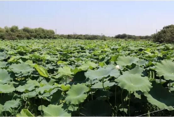 荷塘落玉是农庄荷花观赏区,木制小桥四通八达,凭栏观荷听潺,小河、白云交相辉映。