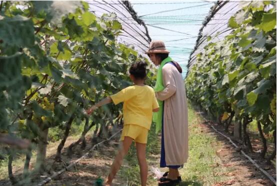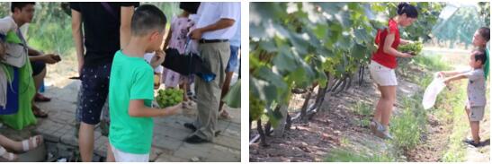 我们跟着采摘园的工作人员引导,来到了采摘处,家长拿着剪刀,小朋友拿着塑料袋,一个个弯腰钻进了葡萄棚内摘起了葡萄。虽然阳光很烈,但是孩子们还是很开心的摘着葡萄,互相之间玩耍着。
