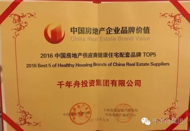 9月21日,由中国房地产业协会、上海易居房地产研究院中国房地产测评中心主办的2016中国房地产企业品牌价值测评成果发布会暨房地产品牌发展高峰论坛在厦门举行。千年舟集团应邀出席,并获得“2016中国房地产供应商健康住宅配套品牌TOP5”殊荣。