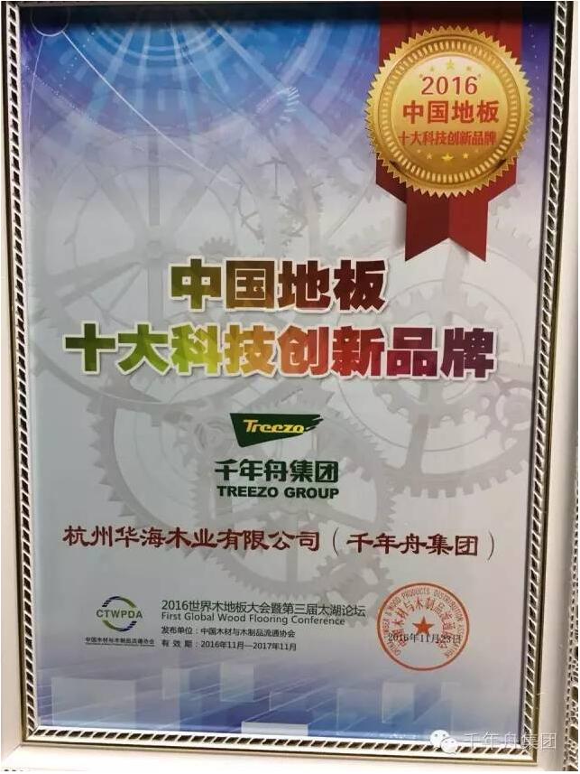 11月23日,世界地板业工商峰会在地板之乡——湖州南浔举行,此次峰会上评选出了中国地板十大科技创新品牌奖项,千年舟不负众望荣登科技创新奖榜首。