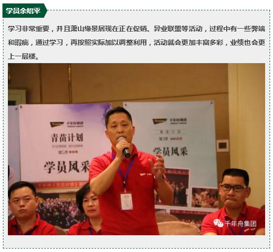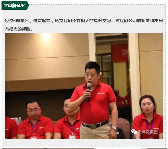 结业典礼在一段回顾视频中拉开序幕。千年舟事业部副总经理兼杭州千年舟新材销售有限公司总经理兼杭州千年舟家居销售有限公司总经理田茂华致结业词。田总称,6期的学习结束了,我们的学习之路没有结束,学而时习之,学到用到才是真的。接下来的市场变革非常非常严肃,我们的战略定位会从经销商变成战略服务商,从服务商变成我们的战略合伙人,在这样的变革下,对服务商的要求就变得更高了,首先要有团队,其次团队必须要有设计师,等等。在这样的转型下,我们的经销商家人如何跟上步伐?这是一个非常犀利的问题,也是我们必须面对的现实。大家在市场上都能感觉到,去年今年整个市场的变革特别明显,尤其是定制这块儿,飞速的发展,包括从原材料角度来说的话,定制领域的原材料也不断提升销量,在这样一个情况下,我们不得不去做转型,而我们转型的方向就是从卖产品到卖服务,从卖产品到卖服务最核心的一个点就是在团队,有什么样的团队首先取决于我们的老板有什么样的意识,老板的格局决定了团队的发展速度。团队的人要不断学习、进步,核心的问题在于我们要在这两万五千里过程中不抛弃、不放弃,一起走到底。但是真的能一起走到底吗?这里要打个很大的问号。因为市场在变革,竞争越来越激烈,我们在改变的同时,可能我们的竞争对手以更快的速度改变,这就是现实状况,所以能够坚持下来报名学习我们的《青苗计划》的家人,首先在思想意识上有了进步、调整,对大家表示嘉许。更重要的是我们如何将所学习的转化成实际行动,去搭建我们的团队,去历练我们的团队,去做一些推广,去从我们的实际行动做改变。这也是我们2017年整个战略规划中对团队培养的核心方向,我们将从理念、思路位置调整到帮带扶,和大家一起去做这些事情。相信在已经到来的2017年我们会做的更棒!