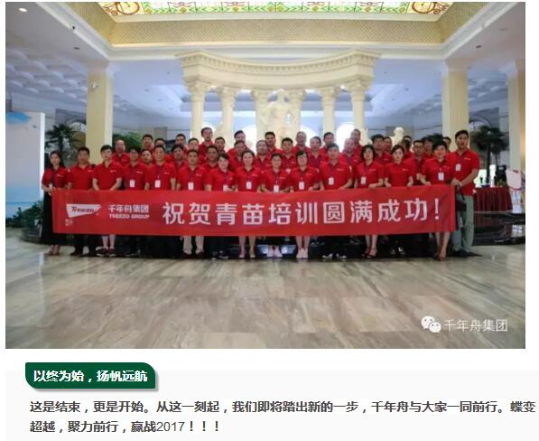 2月22~23日,千年舟集团《青苗计划》第6季暨结业典礼在三亚隆重举行。千年舟青苗计划是以学习,积累、提升经销商业务能力为目的,培训课程极具实用性。集团希望借课程培训,解决经销商在门店销售及管理上遇到的各类问题。