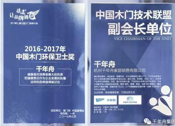3月23日,上海。在第七届中国木门品牌大会上,千年舟集团荣耀斩获“2016-2017中国木门环保卫士奖”,并成为“中国木门技术联盟副会长单位”。两项至高荣耀,让千年舟这一绿色品牌再次绽放,不仅收获了行业内外的一片赞誉,也在消费者的心中筑起了一座绿色的品牌丰碑。