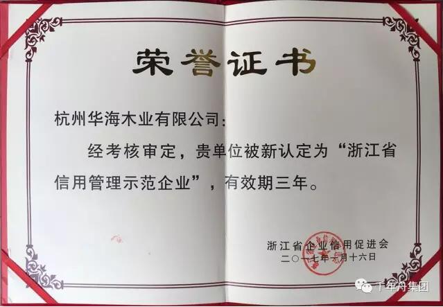 近日,经杭州华海木业有限公司申报,由浙江省企业信用促进会专家组考核测评,并报准浙江省工商局同意,正式认定杭州华海木业有限公司为2016年度“浙江省信用管理示范企业”。