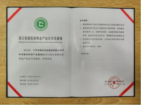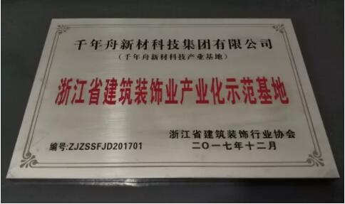 此次获得“浙江省建筑装饰业产业化示范基地”荣誉称号是浙江省建筑装饰行业协会对千年舟的充分肯定和认可。今后,公司将继续加快科技创新步伐,不断运用新技术、新材料、新工艺,努力向建筑信息化、工厂化、智能化、标准化方向发展。