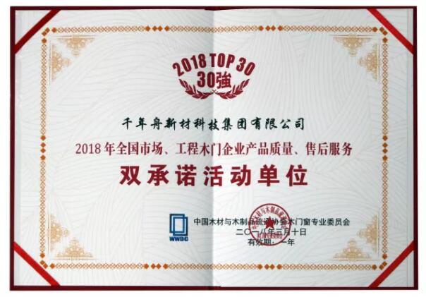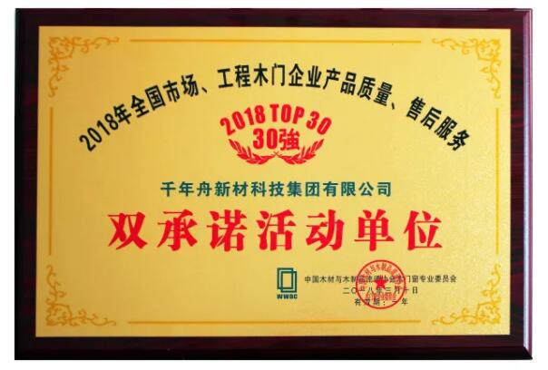 会议现场,2018年木门双承诺活动企业榜单隆重揭晓,千年舟集团荣获“全国市场、工程木门企业产品质量、售后服务双承诺活动单位”殊荣。
