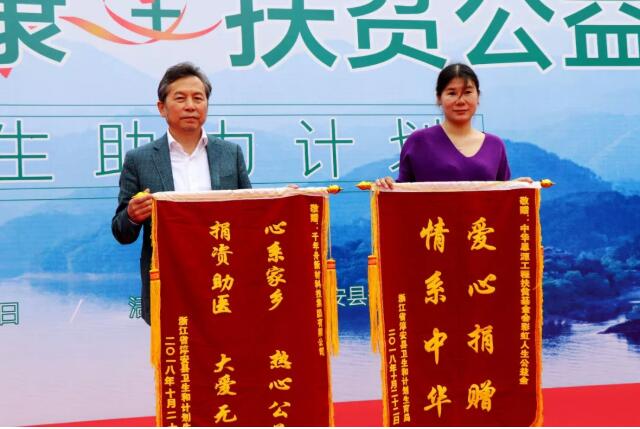 与此同时,为感谢千年舟本次捐赠,淳安县卫计局专门制作锦旗,现场淳安县卫计局正局级组织员叶红彪先生向千年舟新材科技集团有限公司董事长陆铜华先生、思源·彩虹人生公益基金主任修华雪女士赠送锦旗。