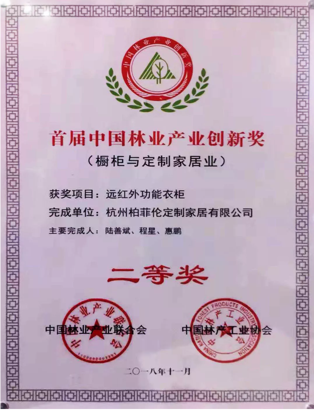 11月9日,首届中国林业产业创新奖(橱柜与定制家居业)结果公布,杭州柏菲伦定制家居有限公司远红外功能衣柜荣获二等奖。