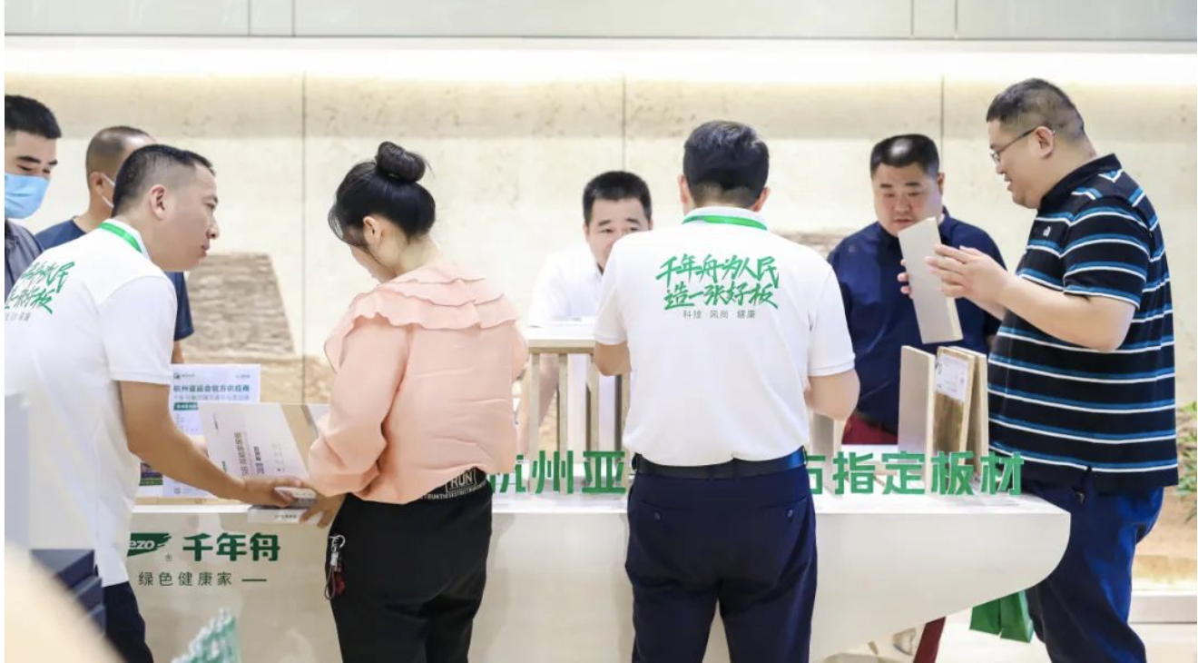 这一次,千年舟携“传承共生,碳寻未来”主题展位亮相菏泽,传承自5000年良渚文明深厚的文化内涵和绿色低碳工艺锻造出的亚运冠军品质好板,全方位实力呈现,让所有逛展客户驻足流连。