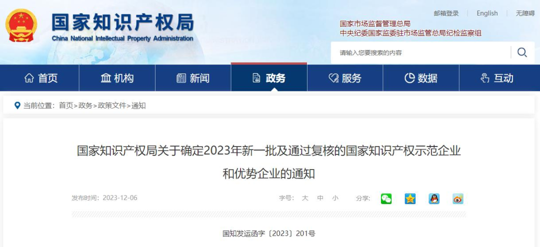 12月6日,国家知识产权局发布了《国家知识产权局关于确定2023年新一批及通过复核的国家知识产权示范企业和优势企业的通知》,千年舟集团成功入选国家知识产权示范企业。