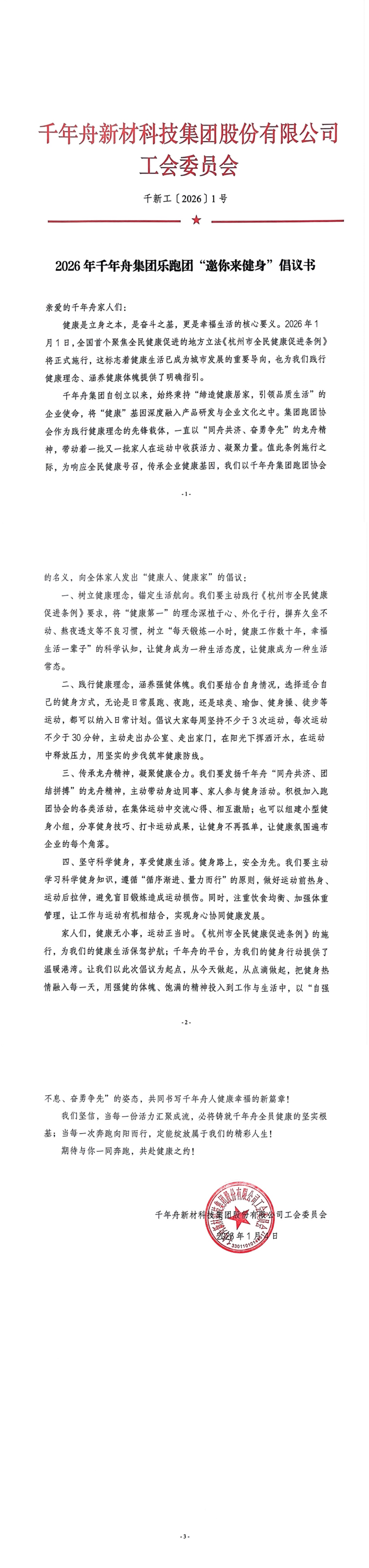 健康是立身之本,奋斗之基。全国首个聚焦全民健康促进的地方立法《杭州市全民健康促进条例》于2026年1月1日正式施行,千年舟集团工会及时响应号召,发布《2026年千年舟集团乐跑团“邀你来健身”倡议书》,以集团工会乐跑团为载体,向全体家人发出“健康人、健康家”的健身号召,传承企业健康基因,响应全民健康导向。