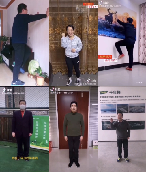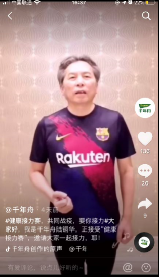 千年舟“3+X健康接力赛“主要通过千年舟集团钉钉群、抖音、微信朋友圈等三大渠道进行发布,参赛人可选择陆董事长视频中示范的一种运动,持续30秒,并@3位好友一起接力完成健康挑战,拍摄视频并发布至抖音、朋友圈中,点赞数高的可获得防护口罩等健康防护工具。”