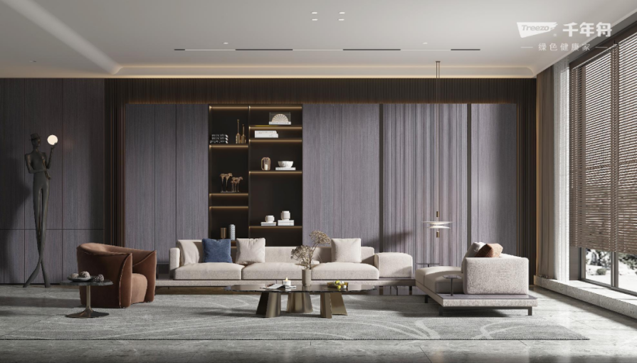 隐藏式灯带层板和雁行意木墙板结合,打造高级质感,简洁的色调显得更为平衡统一,诠释着平和淡雅的心境。