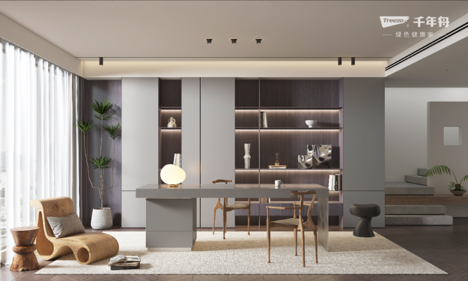 书房常被使用者投注大量个人色彩,以至于成为一个人精神世界的外化体现,沉稳雅致的空间布局,传递出稳重的气质与精致的格调。素雅别致的色彩穿插于木纹与灰色之间,栅格板静置陈列,简洁柜门恬然静谧,在这处不被打扰的空间里,安静享受阅读、安放思绪。